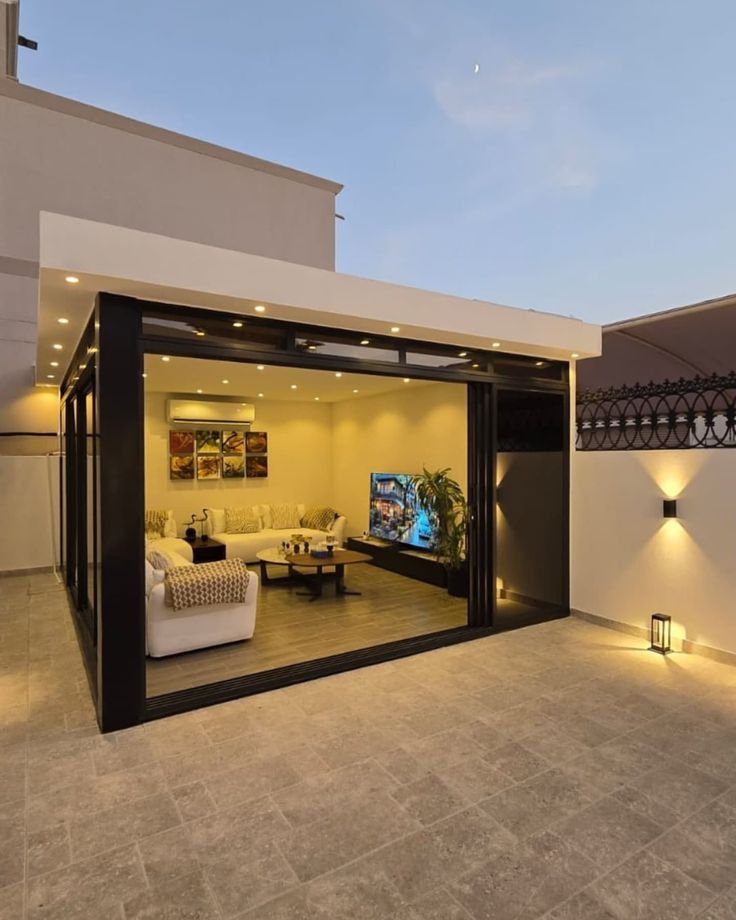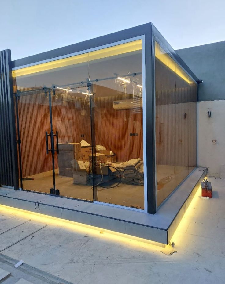ملحق خارجي مودرن (غرفة زجاجية بواجهة سحاب) منفّذ بنظام البناء الخفيف مع تشطيب عصري كامل.هذه تفاصيل التنفيذ والمواصفات الفنية: 0559069442