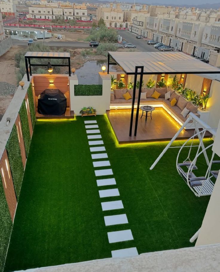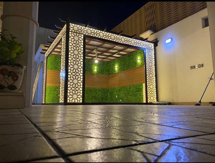 💡 الإضاءةإضاءة LED مخفية حول الأرضية (خطوط محيطية).سبوت لايت داخل السقف لإضاءة هادئة.إنارة جدارية ديكورية تعطي طابع فندقي فاخر.جميع التمديدات مخفية ومقاومة للعوامل الجوية.🌿 تنسيق الجلسةأحواض زراعة مدمجة داخل الجدران.حجر ديكوري أبيض حول الأطراف.جلسات مبنية مع إنارة سفلية (Floating Effect).إمكانية إضافة ستائر أو زجاج لاحقًا.